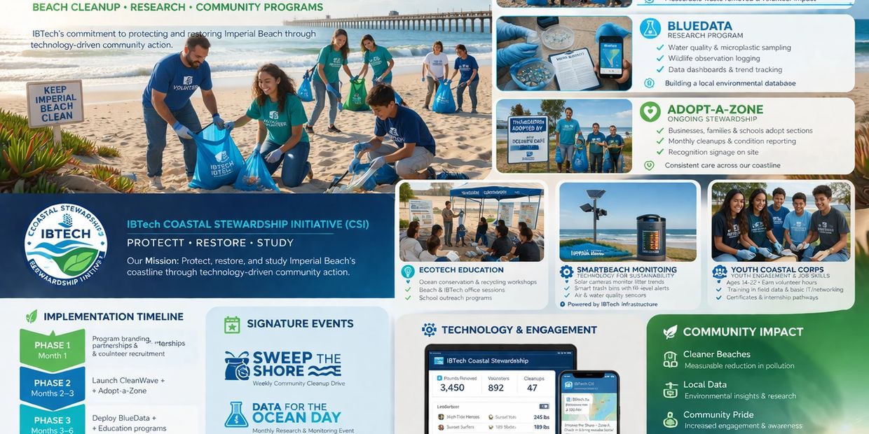 Imperial Beach Technology is proud to launch the Coastal Stewardship Initiative (CSI) a comprehensive, technology-driven community program focused on beach cleanup, environmental research, and public engagement across Imperial BeachThis initiative brings together residents, businesses, students, and volunteers to take direct action in preserving one of Southern California’s most valuable natural resources.